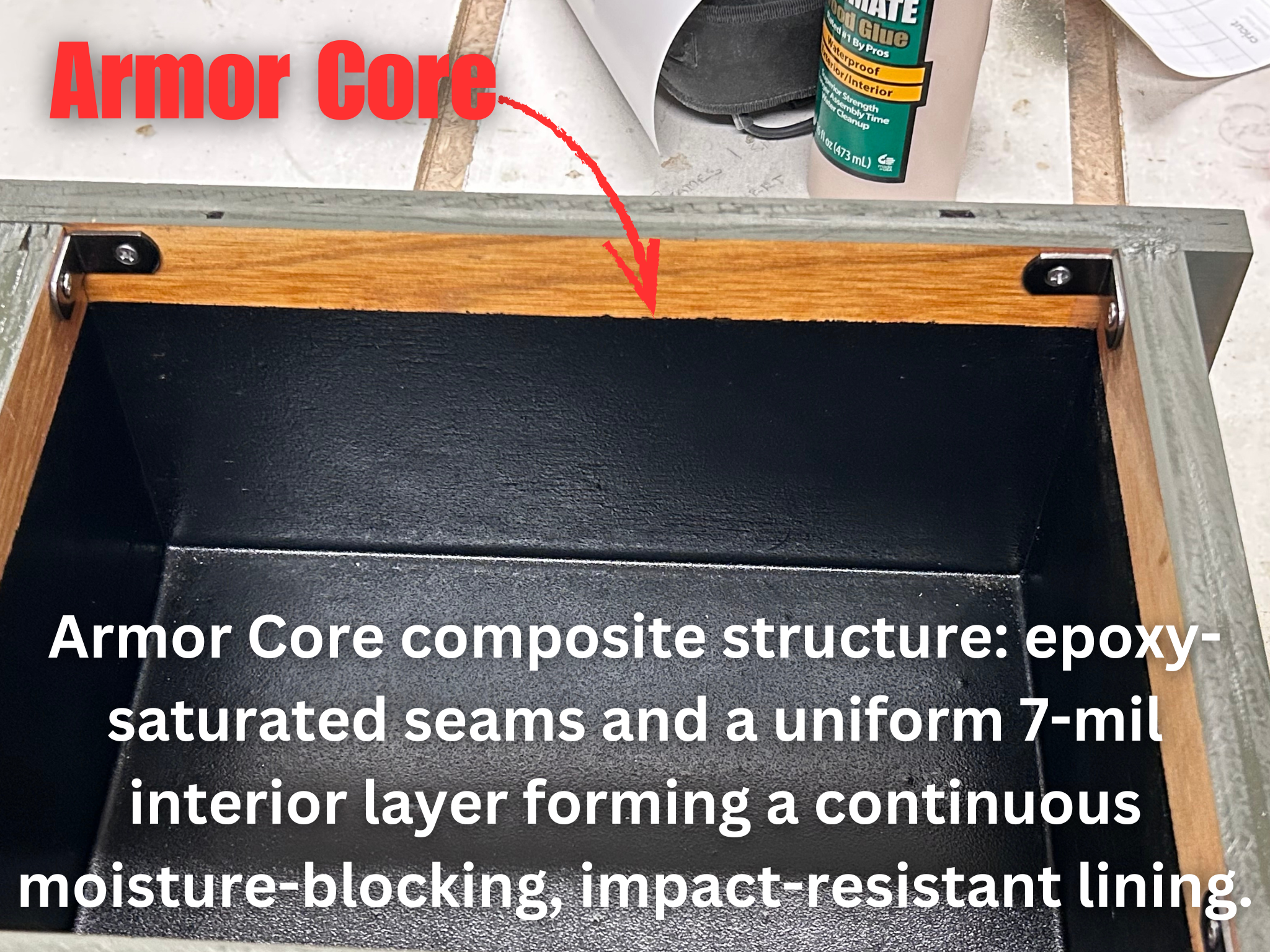 Armor Core is our interior protection system. The idea is simple: seal the wood fibers from the inside out using a penetrating epoxy, then (where appropriate) back it up with a tough liner like a truck-bed–style coating.