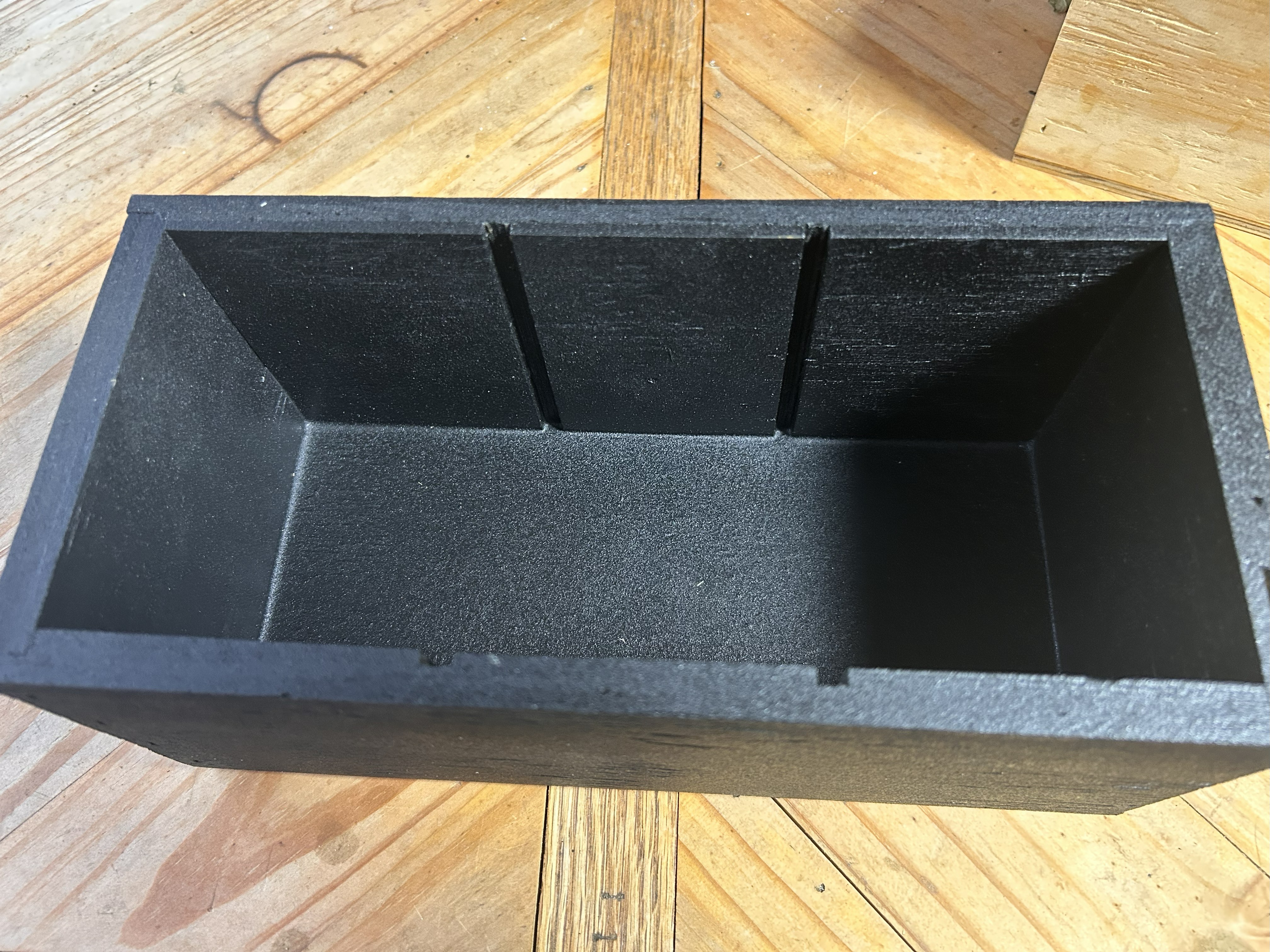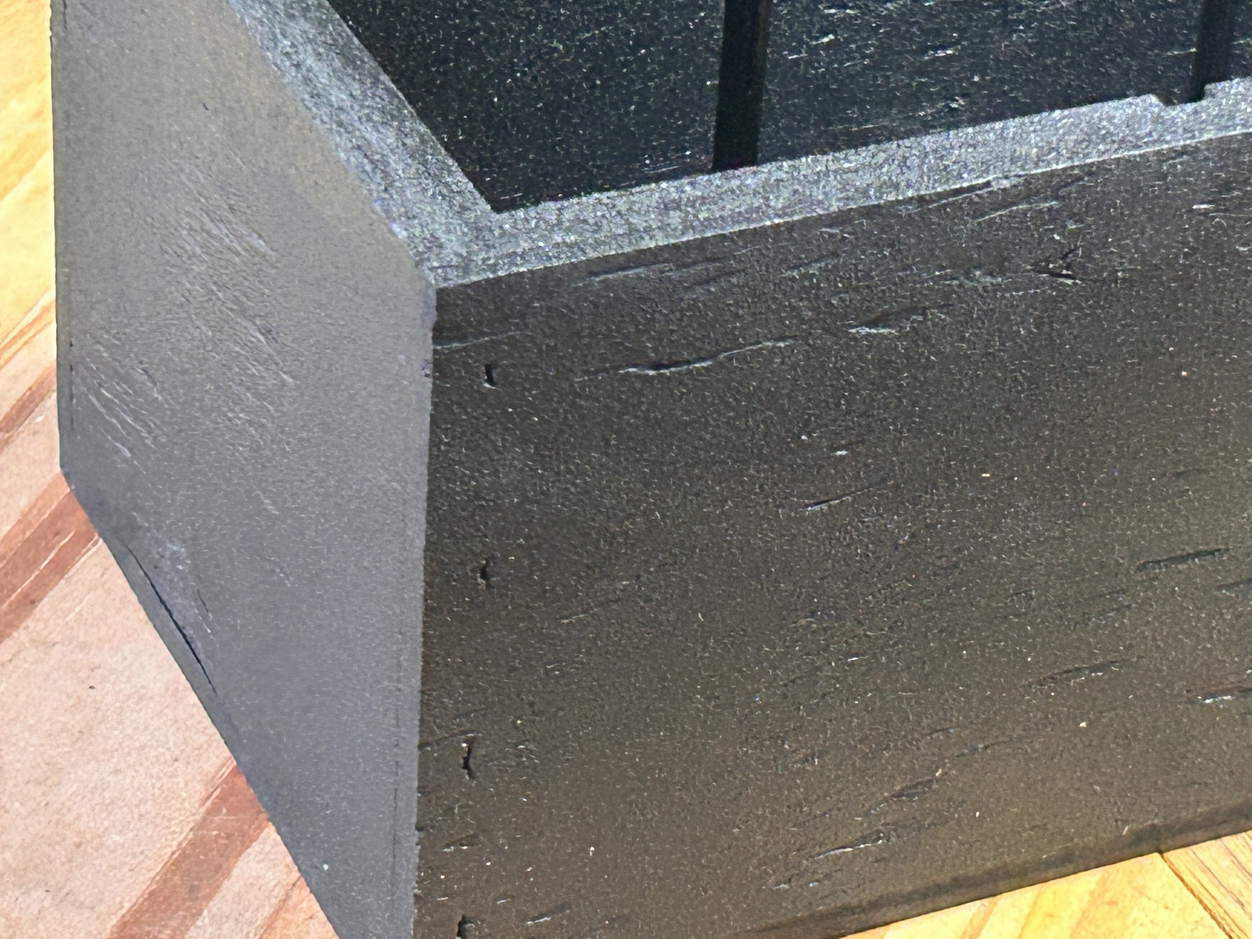 Raw wood is porous, but once we flood the interior with penetrating epoxy and add optional liners, the box behaves more like a composite structure than plain lumber. The epoxy soaks into the fibers, stiffens the panels, and creates a continuous bead in the interior corners of the box.