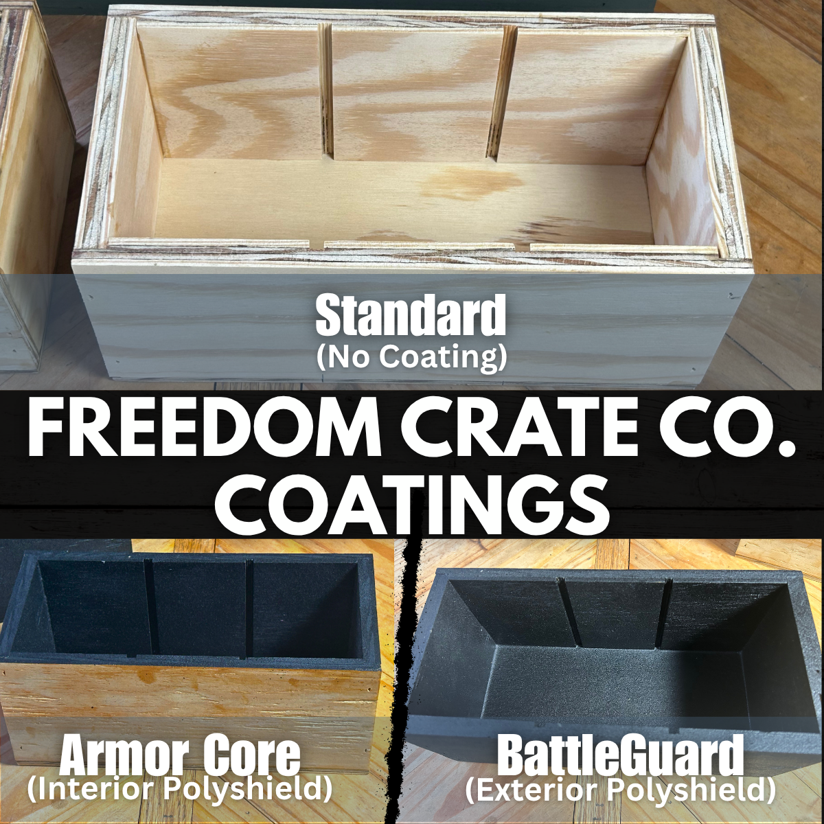 Bottom line: with the right joinery, fasteners, and coatings, wood becomes a lightweight, repairable, high-strength platform. That’s why Freedom Crate Co. starts with wood and then builds Armor Core, Battle Guard, and all future coating systems around it.